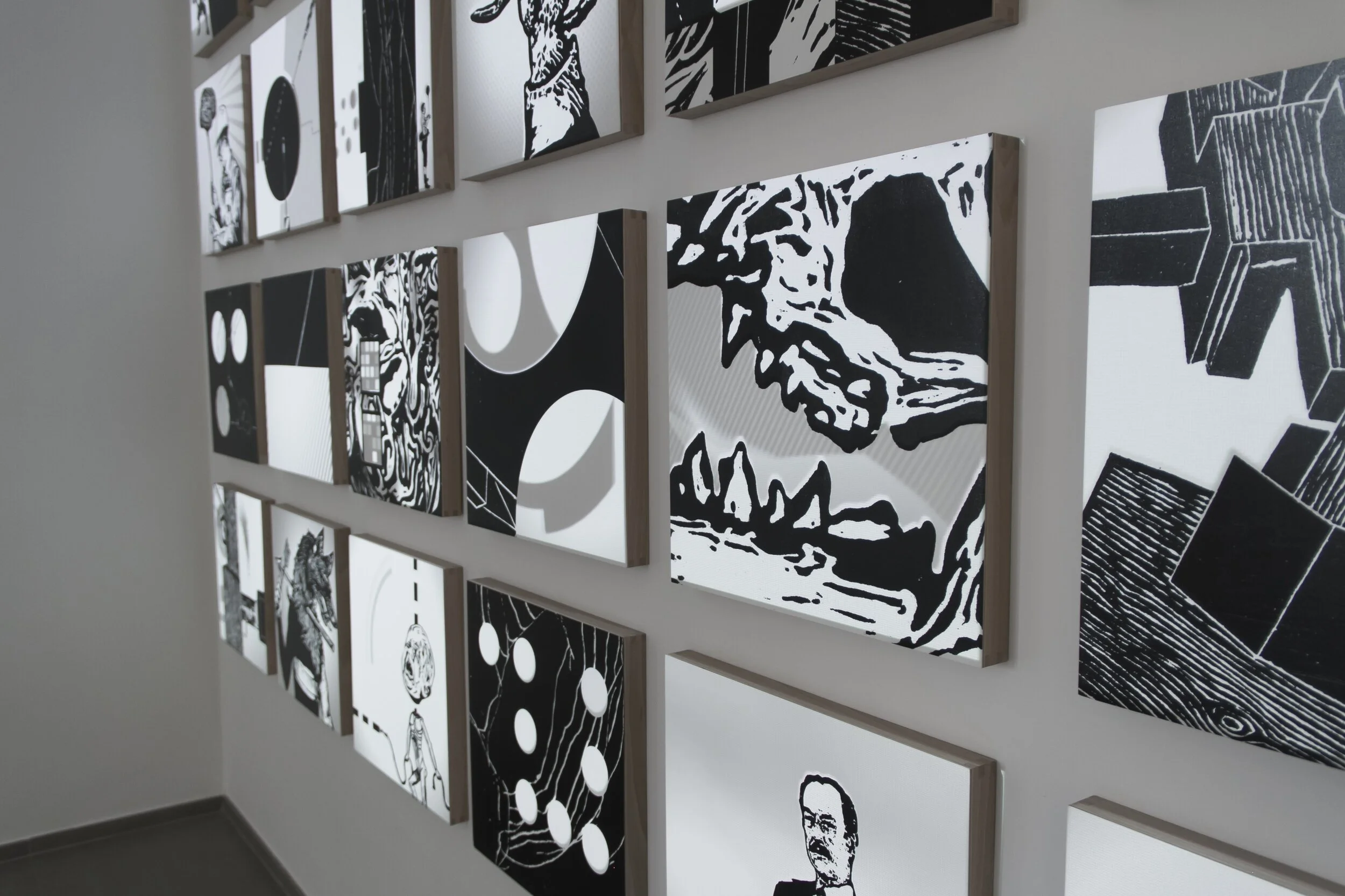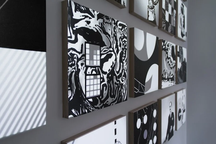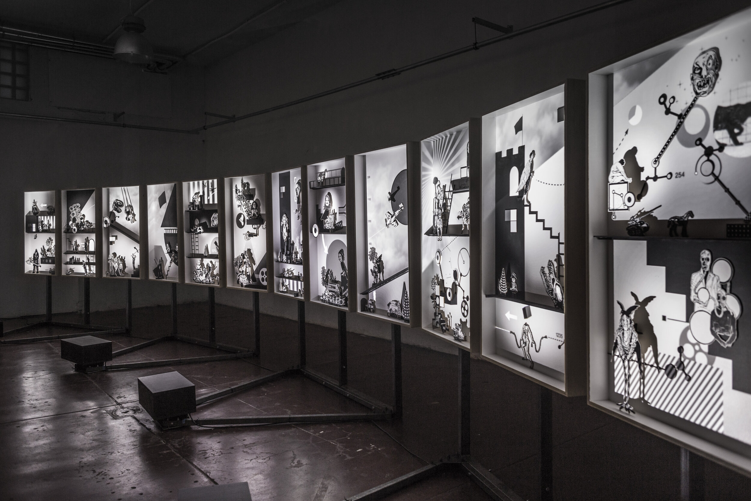Wooden boxes, laser cut, digital print on wood, video projection, metallic structure